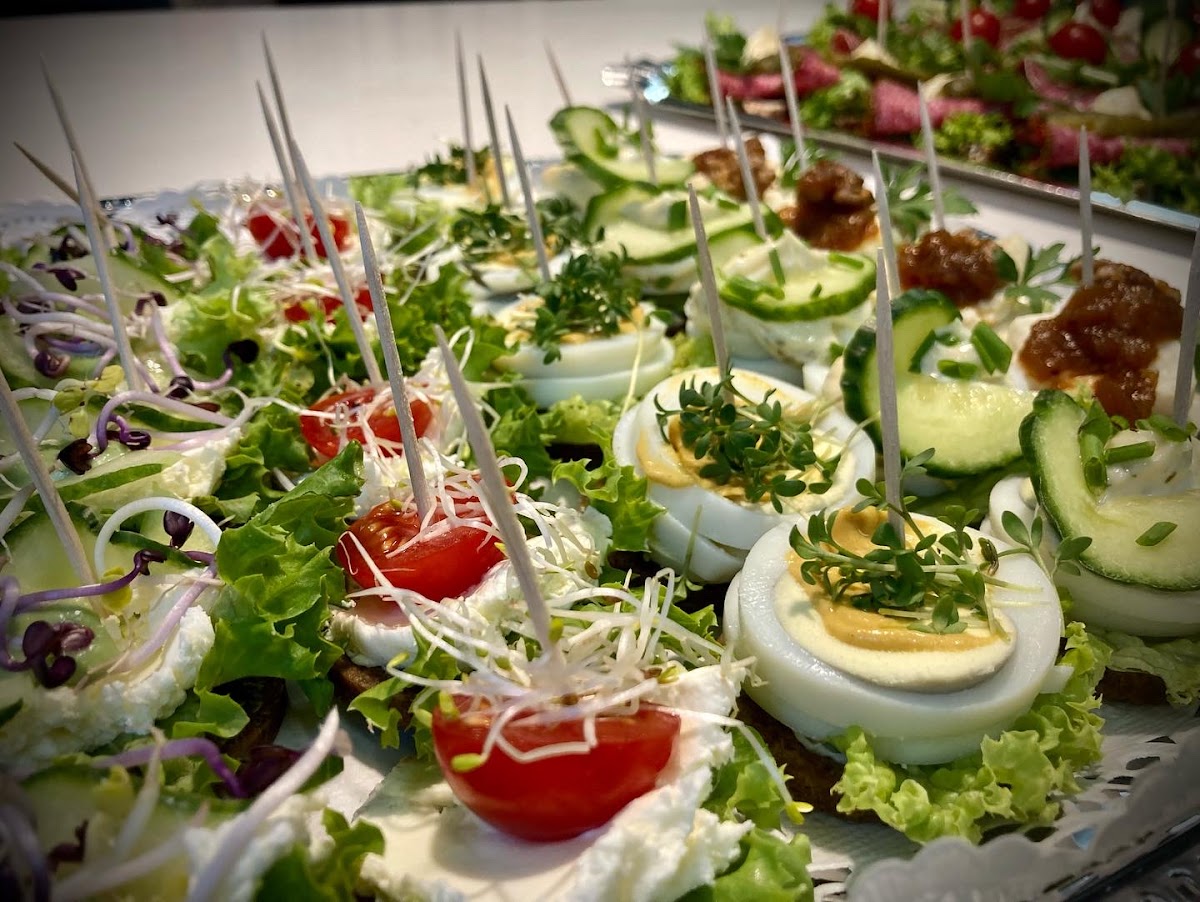 Verschiede Wurst- und Käsesorten stehen zur Auswahl. Salami, Schinken, Pute-Käse mit Salat, Gurke, Tomate.