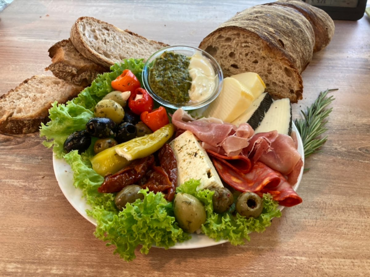 Eine Auswahl an verschiedenen Käse- und wurstsorten stehen zur Auswahl. Mit Salat, Gurke, Tomate.